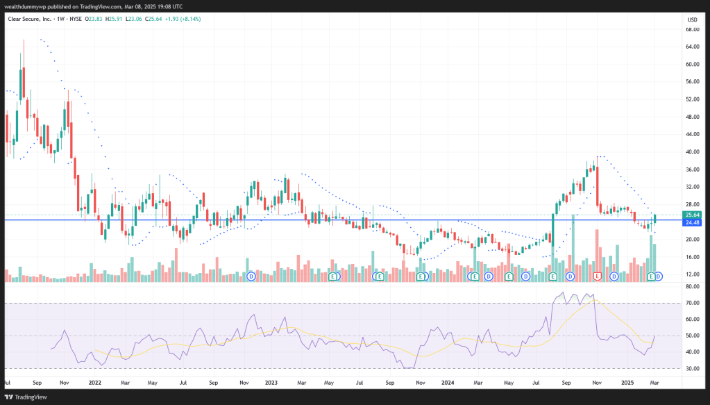 Now we are moving to my third and final stock purchase in March. This is Clear Secure Inc, ticker YOU on NYSE. This is a brand new position for me. My buying price was $24.48. Since it`s my first buy the average price is the same. I will share my thought on the company in a separate post. As of now I just wanted to share that I have started building a position. Let`s have a quick look on the chart: