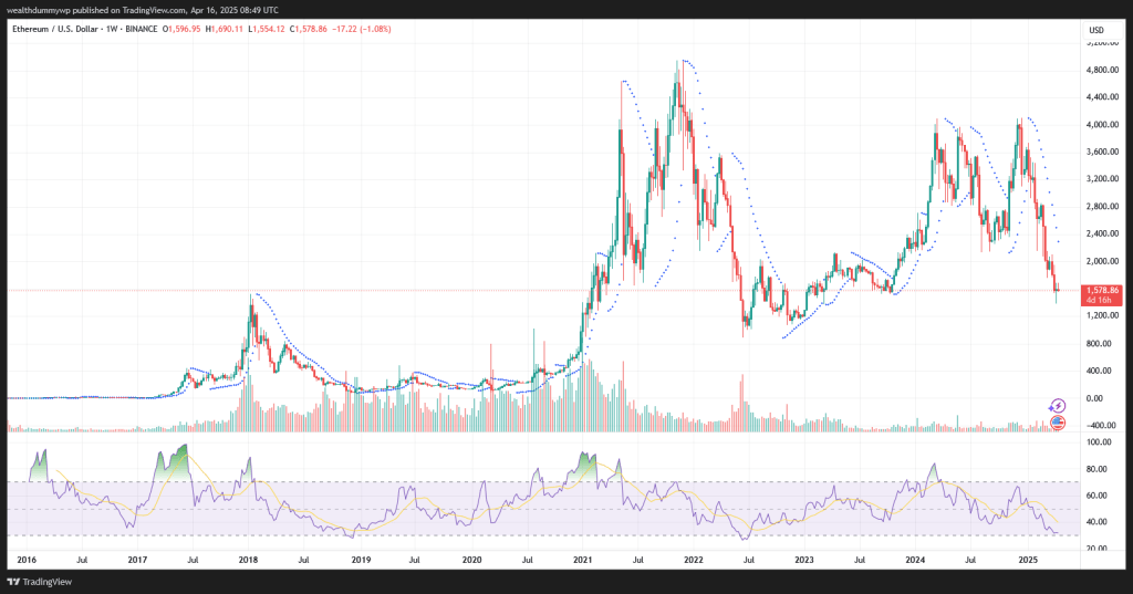This is the weekly chart of ETH. The thing that concerns me is that during the last bull market, ETH wasn`t able to reach its all-time highs. These highs of slightly less than $5 000 were achieved in 2021. In 2024 the highest price was around $4 100 or slightly more. Stay till the end of this post, so I can share with you what I am planning for my ETH position.