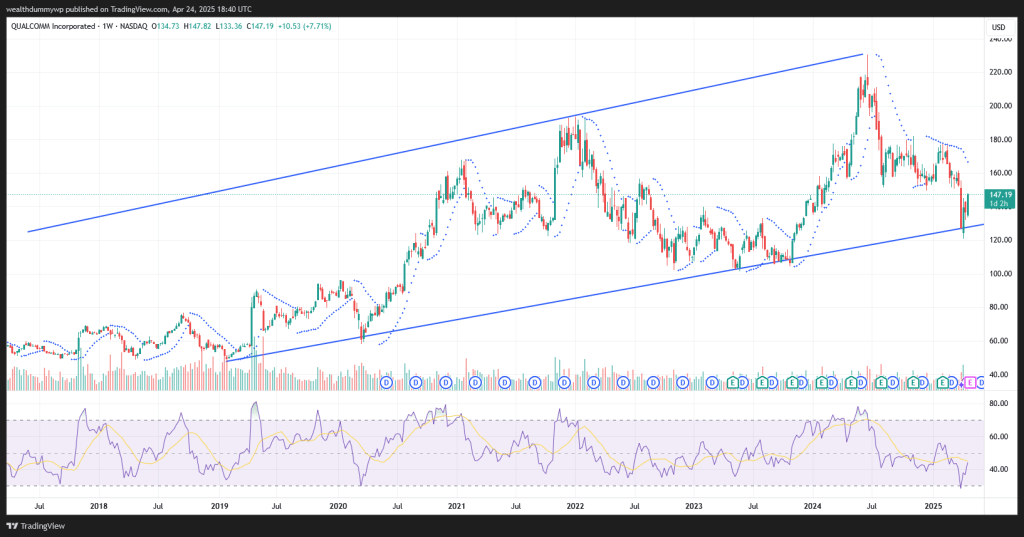 I started building my position in 2023. The first purchase was made on 5th of May 2023. By the end of the year my position was built and the average price was $112.13. I was able to buy in, at a decent price during the market sell off due to the inflation worries. Then I held. In 2024 the market became too optimistic in my opinion. That is why I started selling some of my shares. In two separate transactions I sold almost 50% of my position. The average selling price was $171.15. Obviously, this wasn’t the top, but I underestimated the fact that the market can get a lot more optimistic. Anyway, I was happy with my profit. The return for this one year period was 52.64%. A decent performance in my opinion. Then April 2025 came. The market started selling off, due to tariff worries. Qualcomm`s stock was significantly down from its peak. I saw an opportunity and on 7th of April I bought back some of the previously sold shares. My buying price was $122.70. I made a blog post about this purchase on the same day. It can be found here. Subscribe to my blog or follow me on social media so you don’t miss any of my updates. Anyway, my average acquiring price of the whole position is $117.18. At the time of writing QCOM is trading around $147.