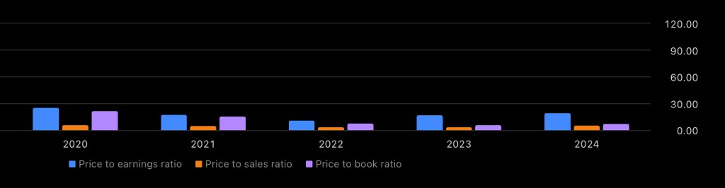 Both, the Gross margin and the Net margin are pretty stable over the years. This is something that I like to see. In 2024 the Gross margin was 56.21% and the Net margin was 25.95%. In my opinion these are good readings. We can see from the graph that there is a decrease in the Return on Equity (ROE). In 2024 the ROE was 42.25%. Despite the decrease in this metric over the years I am happy with the latest number.