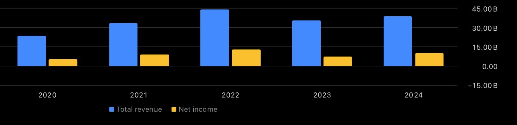 The graph above shows the Total revenue and the Net income starting from 2020 until 2024. There are ups and downs over the years, but the overall trend seems to be going up. The Revenue in 2024 was $38.96 billion and for the 2020 it was $23.53 billion. This means that the company managed to increase its revenue by 65% during this period. The 2024 Net income is $10.14 billion and $5.20 billion in 2020. The Net income increased by 95% over this 5 year period. Will this performance continue in the future? I certainly don’t know. The time will tell. The past performance is already in the books, so I am using it as a starting point. A bit later we’ll discuss the analysts’ expectations.