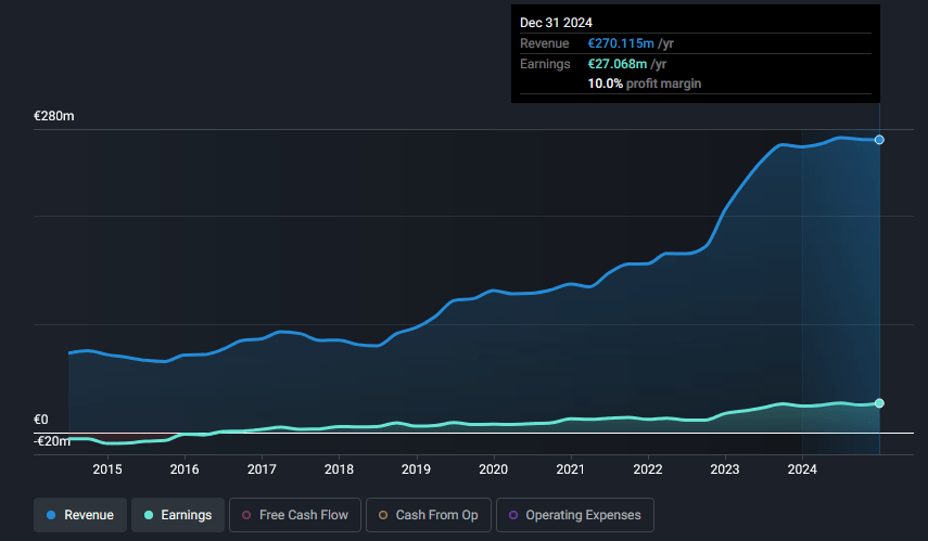 From the chart above, we can observe the growth trajectory of both revenue and net income between 2015 and 2024. In my view, the revenue growth has been very strong. In 2024, the company generated approximately €270 million in revenue. By comparison, at the end of 2015, revenue stood at about €71 million. That’s a remarkable 280% increase over the period.