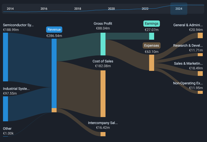 We can see that the majority of the company’s revenue comes from its semiconductor systems segment. In 2024, this segment generated nearly €189 million in revenue. For comparison, in 2016, it brought in about €52 million. That’s more than a threefold increase over the reviewed period.