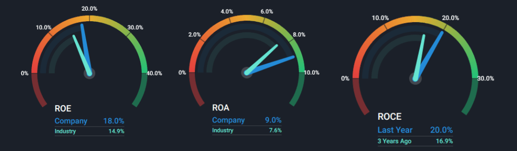 Let’s now examine some of the key ratios. We’ll take a look at return on equity (ROE), return on assets (ROA), and return on capital employed (ROCE).