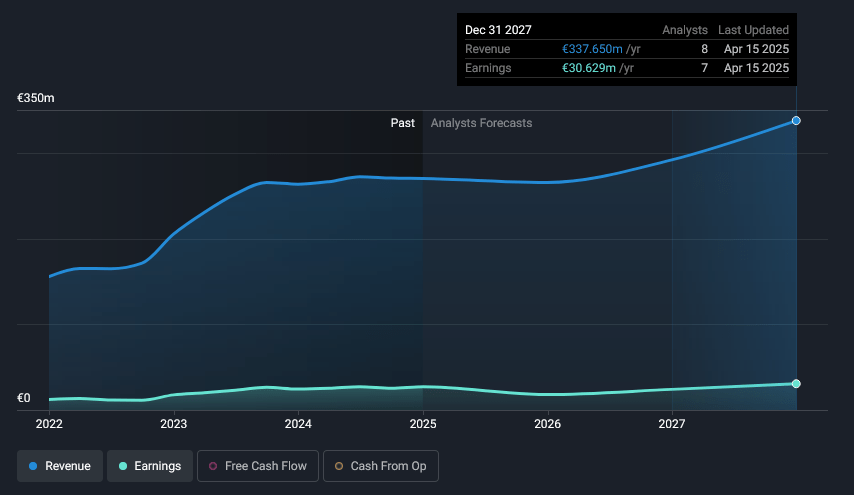 In terms of revenue, growth is still expected. The forecast for 2027 suggests that the revenue will reach €337 million, up from €286 million in 2024. That’s an increase of approximately 17.83%, which is slightly higher than the expected net profit growth.